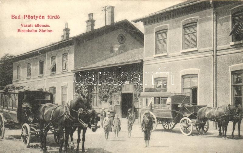 Pöstyén, Pistyan, Piestany; Vasútállomás, lovashintók. Lampl Gyula kiadása / Eisenbahn Station / railway station, horse-drawn carriages