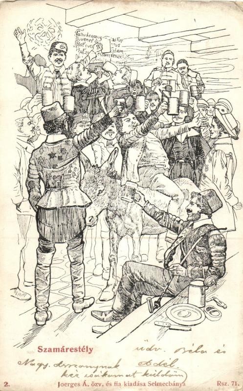 Selmecbánya, Banská Stiavnica; Szamárestély; Tassonyi Ernő "Aki a párját keresi" regényének illusztrációja, Joerges Ágost özvegye és fia kiadása Rsz. 71. / Studentica, illustration s: Mühlbeck Károly (Rb)