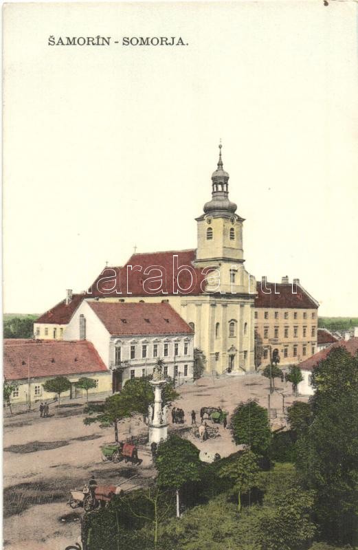Somorja, Somorin, Samoryn; utcakép a templommal, Szentháromság szobor....