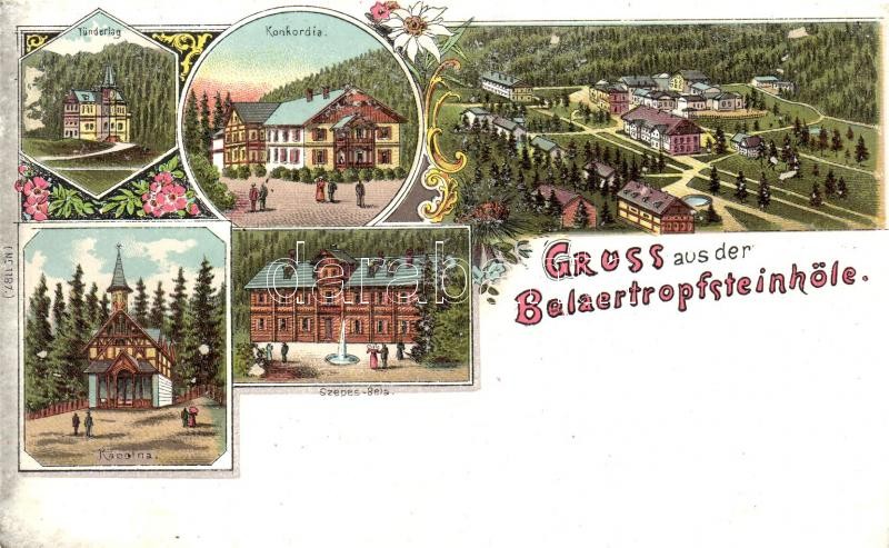Szepesbéla, Spisska Bela; Belaer Tropfsteinhöhle / Bélai cseppkőbarlang, Kápolna, Tündérlak, Konkordia / stalactite cave, hotel, villa, chapel. Floral, Art Nouveau, litho (vágott / cut)