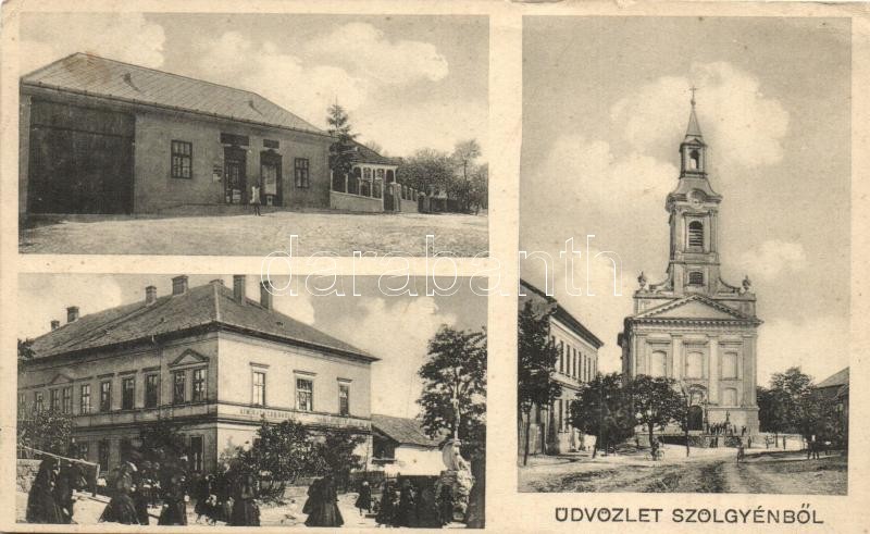 Szőgyén, Szölgyén, Svodín; Katolikus templom és iskola, üzlet / church...