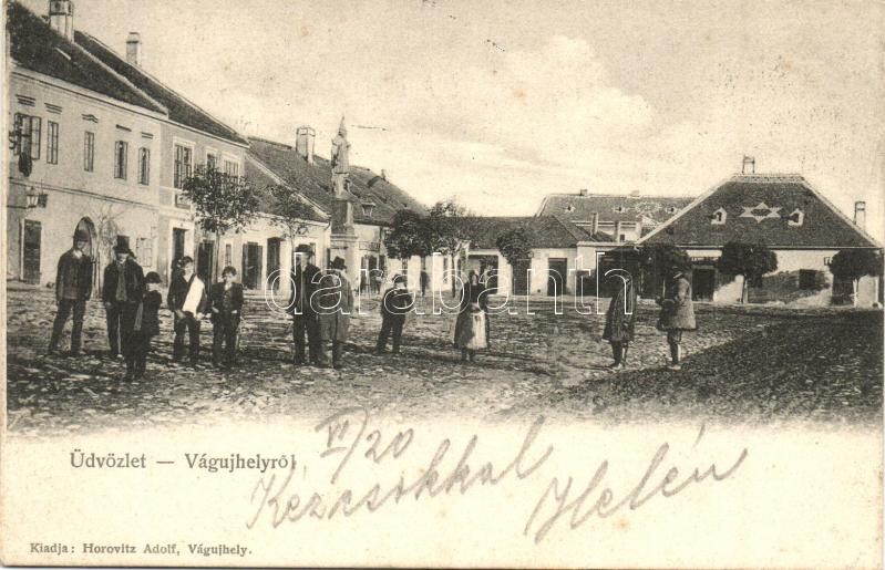 Description: Vágújhely, Nové Mesto nad Váhom, Waag-Neustadtl; Fő tér szoborral, üzlet zsidó csillaggal a háztetőn / main square with statue, shop with Jewish Star of David on the roof