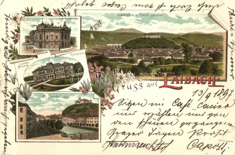 Description: 1897 (Vorläufer!) Ljubljana, Laibach; Landestheater, Landes Museum Rudolfinum, St. Jacobsdamm / theatre, museum, dam. Art Nouveau, floral, litho (tiny tear)