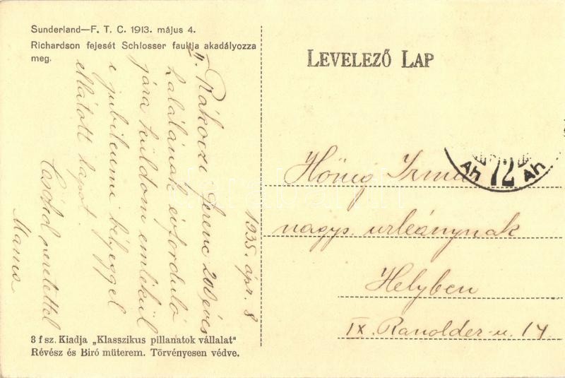 1913. május 4. Sunderland - FTC labdarúgó mérkőzés. Richardson fejesét... https://www.darabanth.com/en/28-Major-auction/28.1/Postcards/Sport~11380/1913-majus-4-Sunderland--FTC-labdarugo-merkozes-Richardson-fejeset-Schlosser-faultja-akad~II1682535