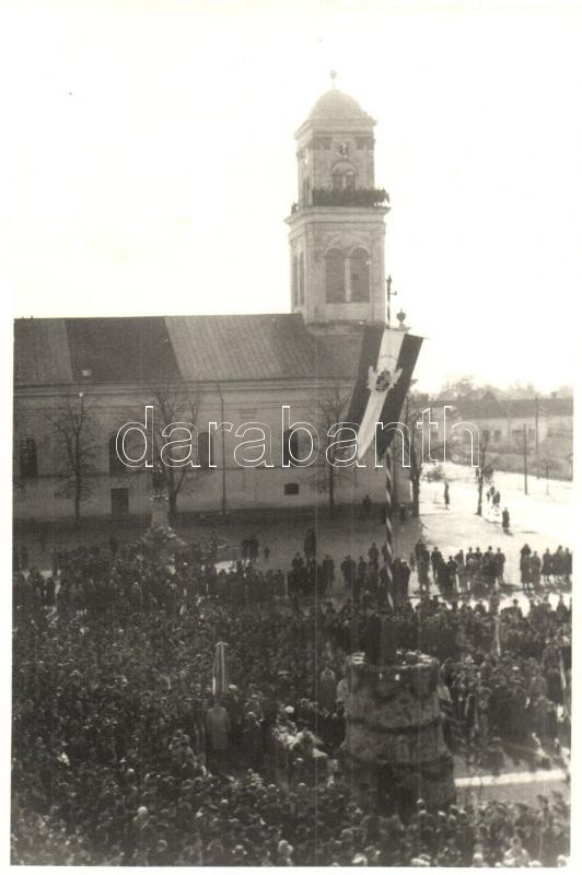 1940 Nagyszalonta, Salonta; Országzászló avatás. A lobogó zászló a templom előtt / Hungarian Flag inauguration. Flying flag with church. photo