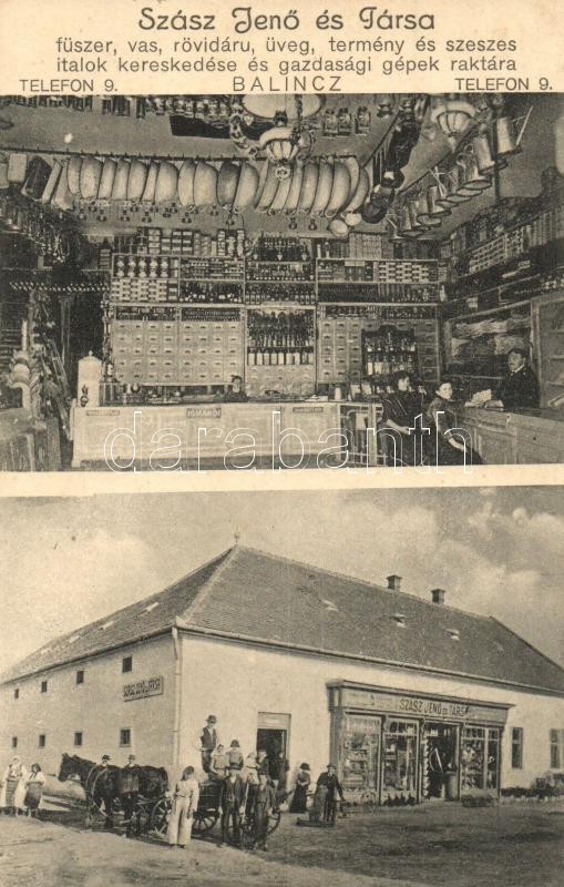 Bálinc, Balint; Szász Jenő és Társa üzlete, belső és külső nézet. Kuge...