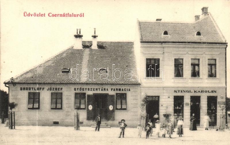 Csernátfalu, Cernatu (Négyfalu, Sacele); Drodtloff József gyógyszertára, Stingl Karolin üzlete és saját kiadása / pharmacy, shop