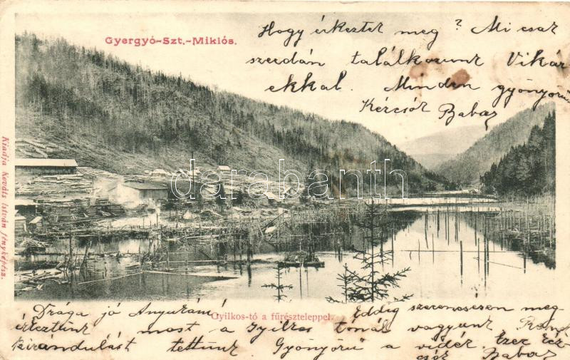Gyergyószentmiklós, Gheorgheni; Fűrésztelep a Gyilkos-tó partján. Kiadja Kováts István fényképész / saw mill at the lake