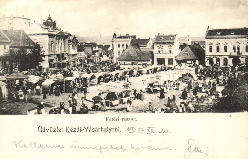 Kézdivásárhely, Targu Secuiesc; Fő tér, piac, Dávid Gyula üzlete / mai...