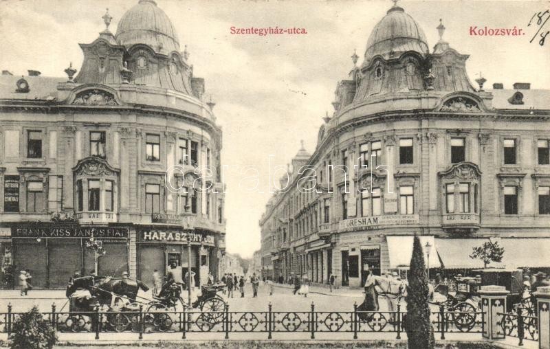 Kolozsvár, Cluj; Szentegyház utca, Frank Kiss János Fiai, Haraszthy Je... https://www.darabanth.com/en/28-Major-auction/28.1/Postcards/Transylvania~11304/Kolozsvar-Cluj-Szentegyhaz-utca-Frank-Kiss-Janos-Fiai-Haraszthy-Jeno-uzletei-Triesti-Alta~II1680206