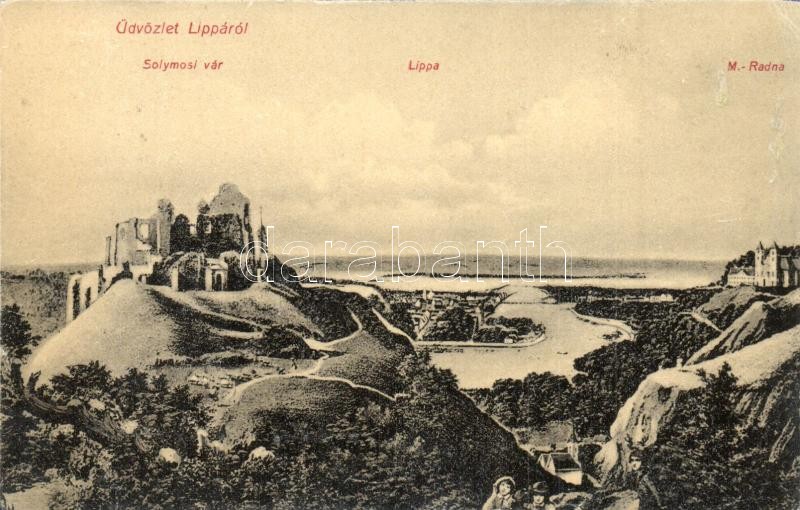 Lippa, Lipova; kilátással a Solymosi várromra és a Máriaradnai kegytemplomra, Konstantin Sándor kiadása / castle ruins, church (EK)