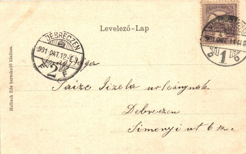 Description: Marosvásárhely, Targu Mures; Cs. és kir. tiszti pavilon, floral Art Nouveau litho keretben lópatkóval. Holbach Ede kiadása / K.u.k. military officers' pavilion, floral Art Nouveau litho frame with horse schoe