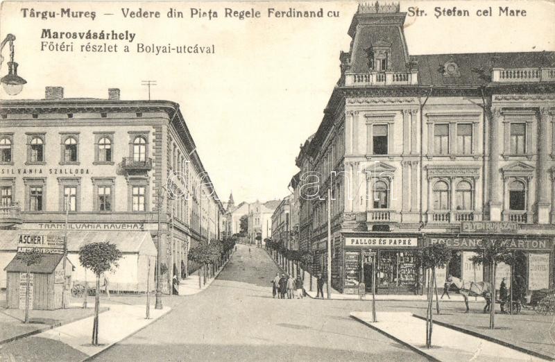 Marosvásárhely, Targu Mures; Fő tér, Bolyai utca, Transilvania szálloda és kávéház, Pallos és Papné, Bocsánczy Márton, Ascher I. üzletei. Porjes S. Sándor kiadása / main square, street, hotel and café, shops (EK)