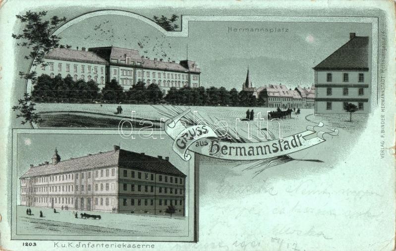 Nagyszeben, Hermannstadt, Sibiu; Hermann tér, Cs. és kir. Gyalogsági laktanya / Hermannsplatz, K.u.k. Infanteriekaserne / square, infantry barracks. F. Binder silver Art Nouveau, litho (apró szakadások / tiny tears)