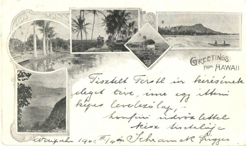 1901 Hawaii, Native Grass Hut, Diamond Head, Oahu railway, locomotive, Lily pond, view from Pali. Art Nouveau (EK)