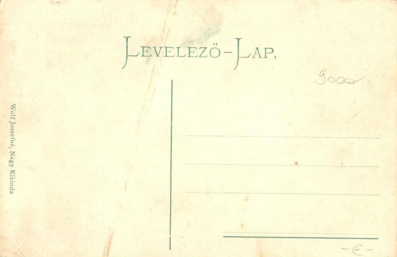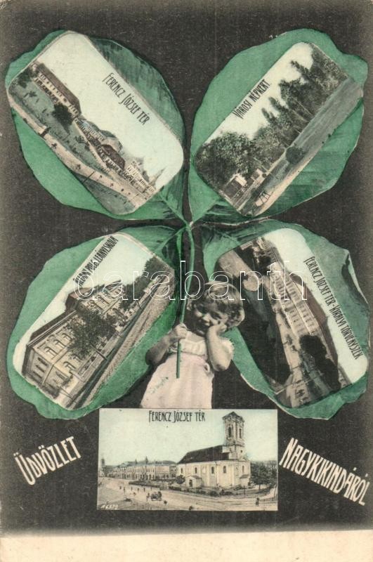 Description: Nagykikinda, Kikinda; Ferenc József tér, Városi népkert, Állami polgári leányiskola, Királyi törvényszék. Lóherés montázslap kislánnyal / square, girl school, court. Clover montage with girl (EK)