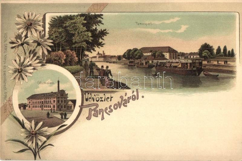 Pancsova, Pancevo; Temespart, Gőzmalom. Kohn Samu kiadása / river bank, steam mill. Floral, Art Nouveau, litho