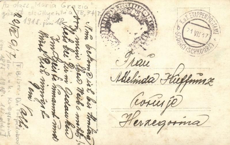 1917 K.u.K. Tb 74 T Torpedóromboló elsüllyeszti az olasz Maria Grazia ... https://www.darabanth.com/en/28-Major-auction/28.1/Postcards/Warship~11360/1917-KuK-Tb-74-T-Torpedorombolo-elsullyeszti-az-olasz-Maria-Grazia-gozost-KuK-Kriegsmar~II1686670