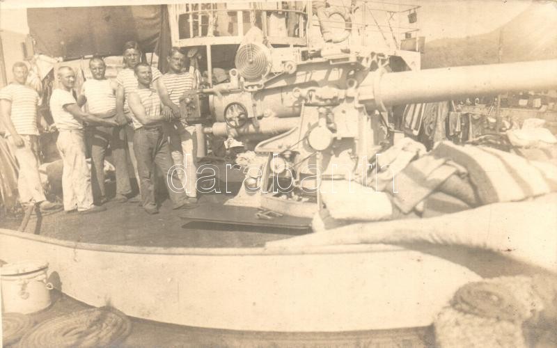 Description: 1917 SMS Orjen osztrák-magyar haditengerészet Tátra osztályú rombolója, matrózok az első ágyú csövét pucolják / K.u.K Kriegsmarine, mariners cleaning the first cannon of SMS Orjen, photo