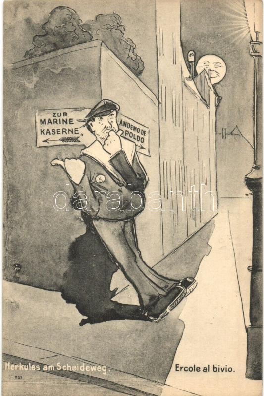 Herkules am Schneideweg, Zur Marine Kaserne / Ercole al bivio, Andemo de Poldo / K.u.K. Kriegsmarine mariner humour. G. Fano, Pola, 1908.