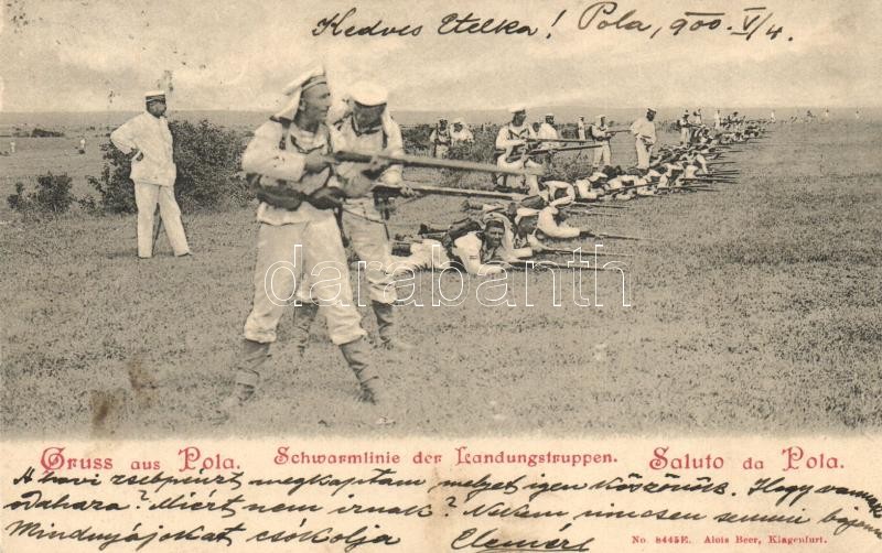 Description: Pola, K.u.K. Kriegsmarine, Schwarmlinie der Landungstruppen. Alois Beer / Osztrák-magyar hadi tengerészek szárazföldi egysége / Austro-Hungarian Navy mariners on mainland training