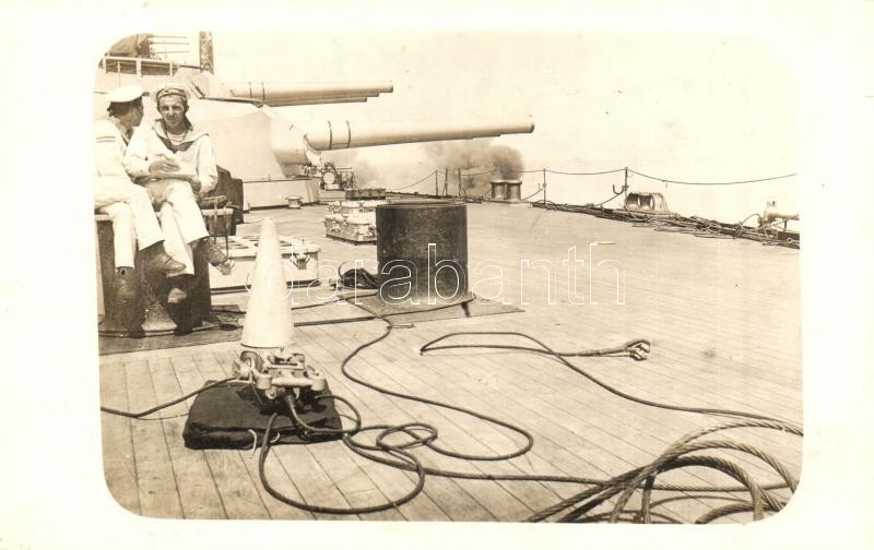Description: SMS Szent István Osztrák-Magyar Haditengerészet Tegetthoff-osztályú csatahajó fedélzete, tornyonként 3-3 löveg. Matrózok levélírás közben / K.u.K. Kriegsmarine / WWI SMS Szent István Austro-Hungarian Navy Tegetthoff-class dreadnought, gun turrets and cannons, mariners during letter writing. photo