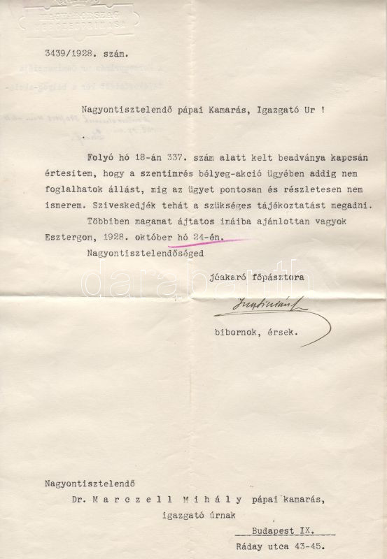 1928 (Serédi) Jusztínián hercegprímás aláírása köszönölevélen