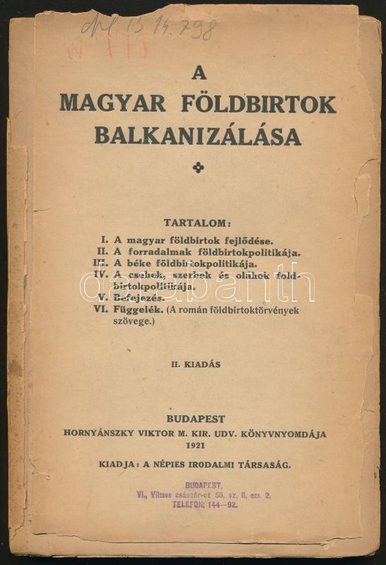 A magyar földbirtok balkanizálása. Budapest, 1921, Népies Irodalmi Tár... https://www.darabanth.com/en/280-Online-auction/280.0/Books/Books-History~31/A-magyar-foldbirtok-balkanizalasa-Budapest-1921-Nepies-Irodalmi-Tarsasag-Hornyanszky-Vikt~II1440343