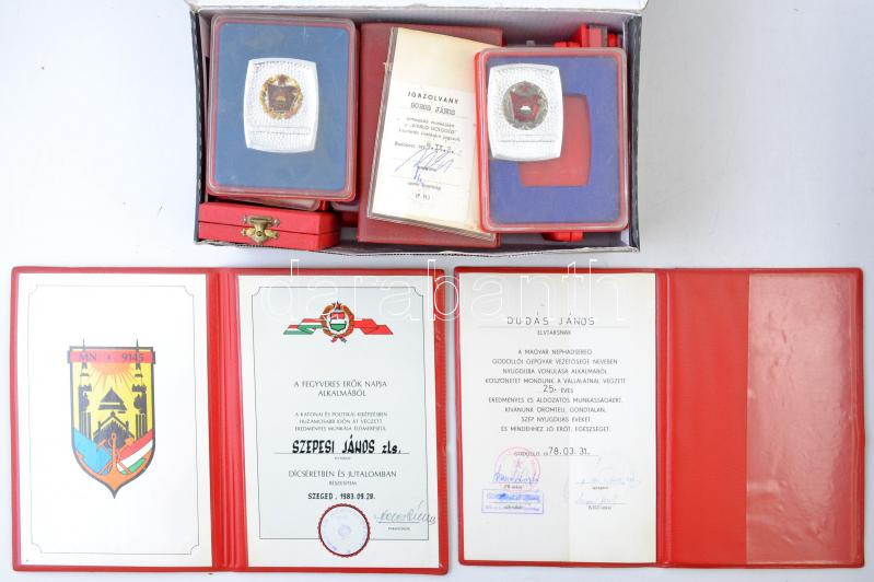Description: ~1970-1980. Nagy doboznyi szocialista érdemérem és kitüntetés, közte "Kiváló Dolgozó", "Szocialista Brigád" kitüntetés, valamint a tételben viselői igazolvány és 2db adományozói okirat T:vegyes