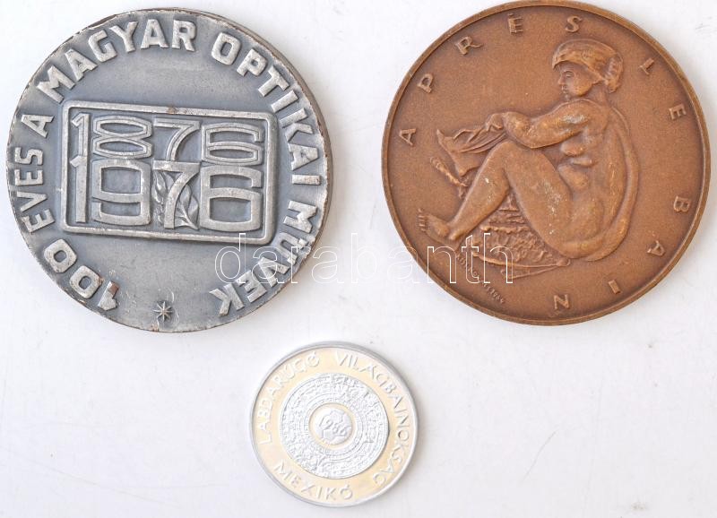 Description: Kiss Kovács Gyula (1922-1984) DN "Renoir - Aprés le bain" Br emlékérem (60mm) + 1976. "Centenárium / 100 éves a Magyar Optikai Művek 1876-1976." ezüstözött Br emlékérem (60mm) + Bognár György (1944-) 1986. "Labdarúgó Világbajnokság Mexikó" Al emlékérem (32mm) T:PP-2 ph., ujjlenyomat