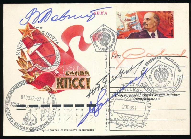 Description: Vlagyimir Kovaljonok (1942- ), Viktor Szavinih (1940- ), Vlagyimir Dzsanyibekov (1942- ) szovjet és Dzsugderdemidín Gurragcsá (1947- ) mongol űrhajósok aláírásai levelezőlapon /