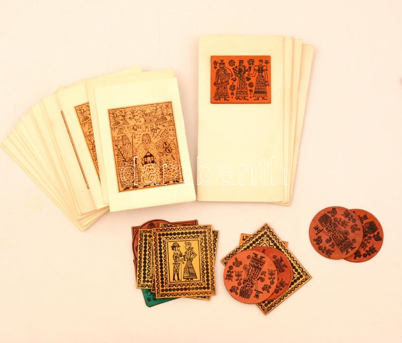 Pirogravír és bőr üdvözlő lapok, kb 50 db