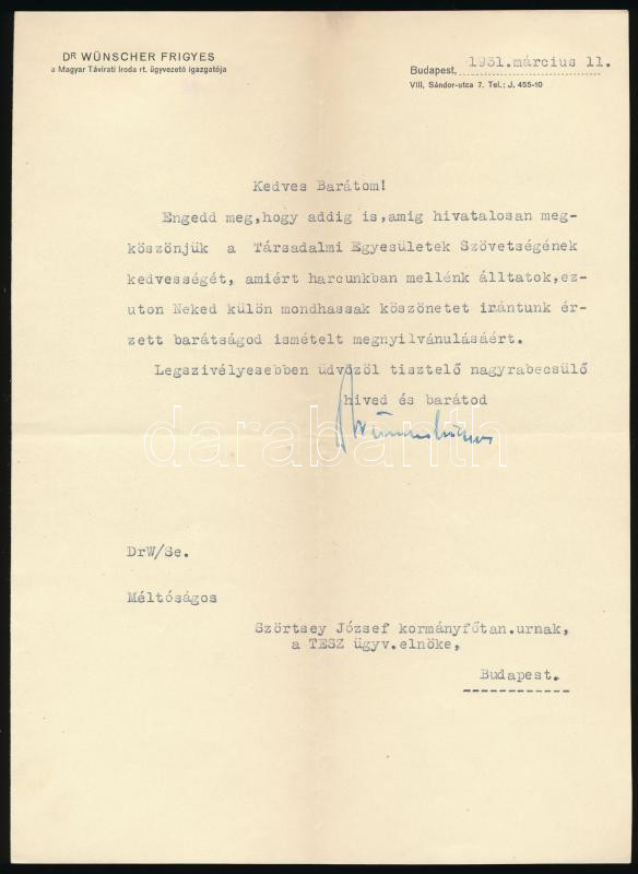 1931 Wünscher Frigyes (1892-1946) MTI-vezérigazgató köszönőlevele Szörtsey József (1888-1941) kormányfőtanácsos úrnak, a Társadalmi Egyesületek Szövetsége elnökének, fejléces papíron, Wünschner aláírásával