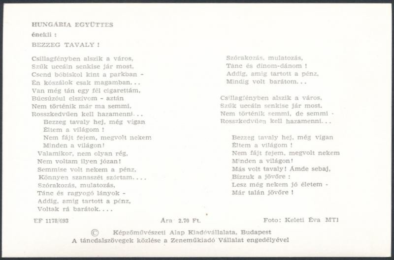A Hungária együttes, fotólap, hátulján dalszöveggel, 10×15 cm