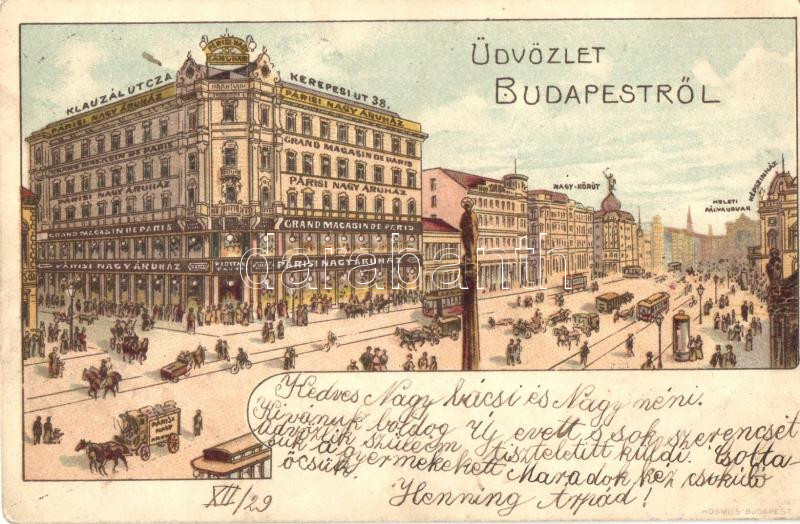 1899 Budapest VII. Párisi nagyáruház a Rákóczi út 38. szám alatt, Nagy körút, villamosok, Kosmos litho (EB)