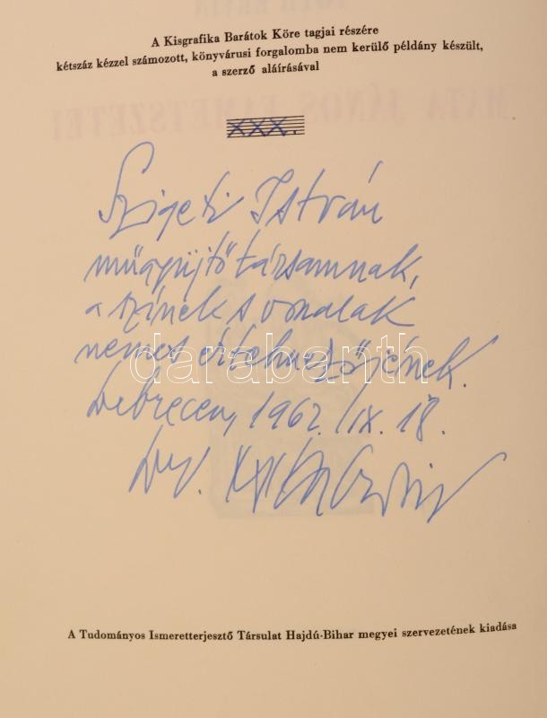 Tóth Ervin: Mata János fametszetei. Debrecen, 1962, Tudományos Ismeretterjesztő Társulat Hajdú-Bihar megyei szervezete. 30. számú, a Kisgrafika Barátok Köre tagjai részére készült, kézzel sorszámozott példány, készült 200 példányban. A szerző által Szigeti István (1906-1981) gyűjtő, numizmatikusnak dedikált példány. Félvászon kötésben, kicsit sérült papír védőborítóval, egyébként jó állapotban.
