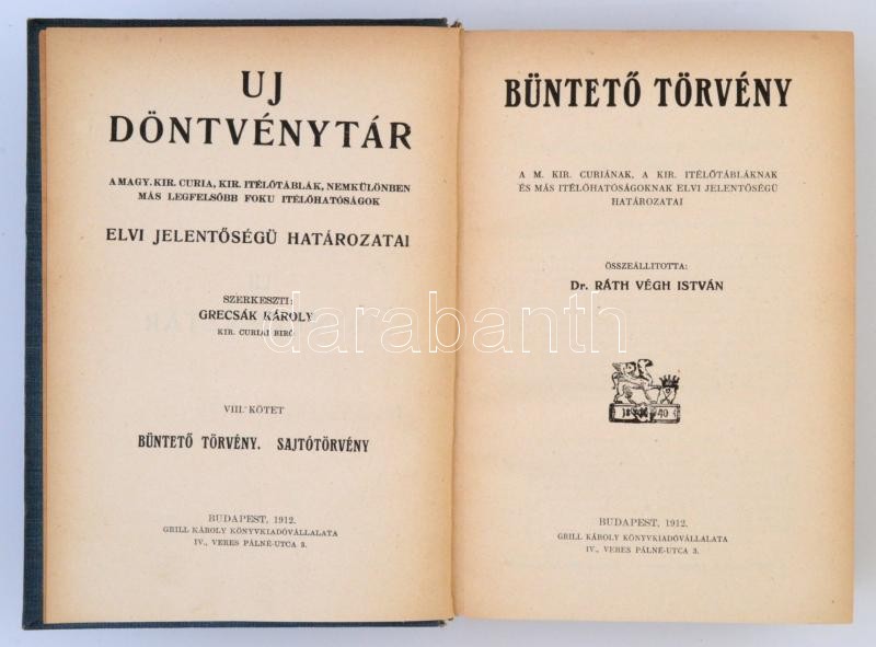 Új Döntvénytár VIII. Büntető törvény. Sajtótörvény. Szerk.: Dr. Ráth-V... https://www.darabanth.com/en/281-Online-auction/281.0/Books/Books-Law~31/Uj-Dontvenytar-VIII-Bunteto-torveny-Sajtotorveny-Szerk-Dr-Rath-Vegh-Istvan-Buda~II1448257