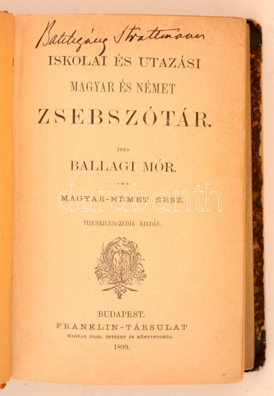 Ballagi Mór: Iskolai és utazási magyar és német zsebszótár. Magyar-német rész. Batthyány-Strattmann László saját kezű bejegyzéssel. Bp., 1899, Franklin-Társulat. Kiadói félbőr kötés, gerincnél sérült, kopottas állapotban.