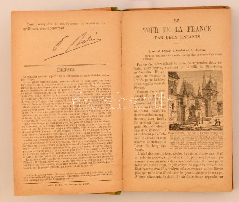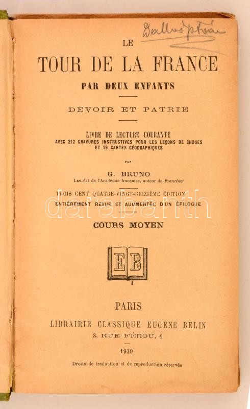 Description: G. Bruno (Augustine Fouillée): Le tour de la France par deux Enfants. Devoir et patrie. Paris, 1930, Libraire Classique Eugéne Belin. Kiadói kopottas, picit foltos félvászon kötés, számos szövegközti képpel gazdagon illusztrálva, francia nyelven. /