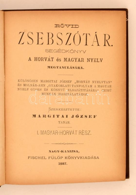 Margitai József: Rövid zsebszótár. Segédkönyv a horvát és magyar nyelv... https://www.darabanth.com/en/281-Online-auction/281.0/Books/Books-Other-rarities~42/Margitai-Jozsef-Rovid-zsebszotar-Segedkonyv-a-horvat-es-magyar-nyelv-megtanulasara-I-m~II1406050