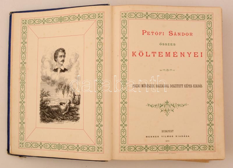 Petőfi Sándor összes költeményei. Hazai művészek rajzaival díszített képes kiadás. Bp., 1879. Mehner Vilmos. 1 t. /Petőfi portréja Barabás rajza után/, 805 p., 5 sztl. lev. Szövegközti rajzokkal illusztrálva /köztük 9 egészoldalas/. Kiadói, festett, aranyozott, dombornyomásos egészvászon díszkötésben, körül aranyozott élmetszéssel. Kopottas kötés, egy lap kijár.