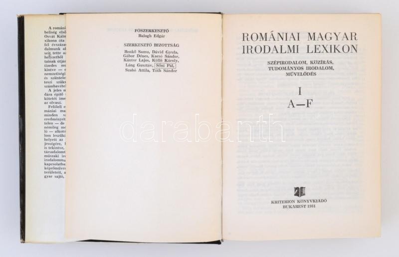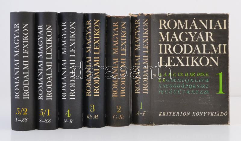 Romániai Magyar Irodalmi Lexikon 1-5. Szerk.: Balogh Edgár, Dávid Gyula. Bukarest-Kolozsvár, 1981-2010, Kriterion Könyvkiadó, Erdélyi Múzeum-Egyesület. Kiadói műbőr kötés, illetve kiadói egészvászon kötés (1. kötet), néhol picit szakadt kiadói papírborítóban. Jó állapotban.