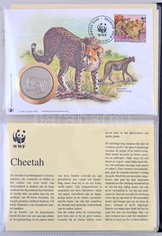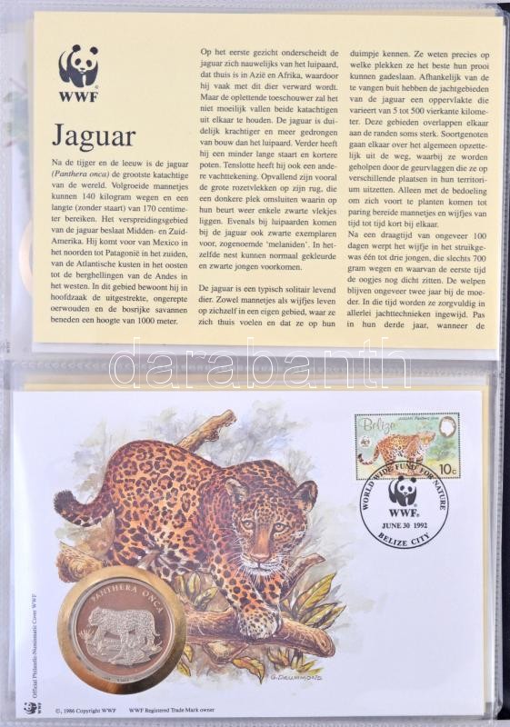 1986. 9db klf "WWF - Természetvédelmi Világalap" érmés bélyeges boríték, FDC, gyűjtői albumban holland nyelvű tájékoztatóval, mind macskafélék témában, közte 1986. "Jaguár" fém emlékérem Belize bélyeggel T:1 1986. 9pcs of diff "WWF - World Wildlife Fund" coin letters with stamp, FDC, all in collectors album with information in Dutch, all about felidae, including 1986. "Jaguar" metal commemorative coin with stamp from Belize C:UNC