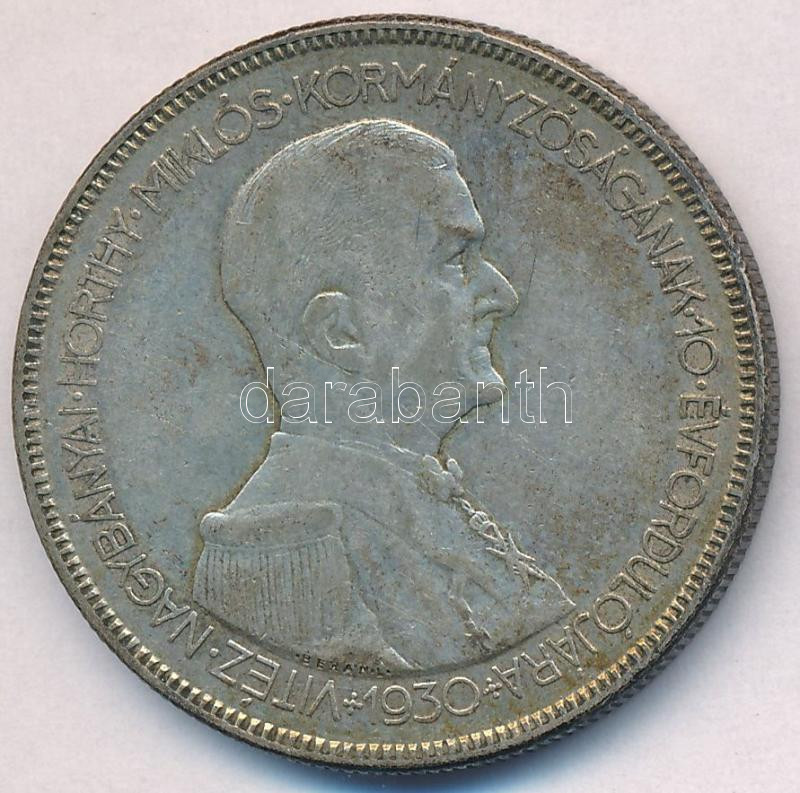 https://www.darabanth.com/en/281-Online-auction/281.0/Numismatics/Hungarian-coins-and-coins-with-Hungarian-mint-marks~300008/1930-5P-Ag-Horthy-jobbra-T2-3-patina~II1446951