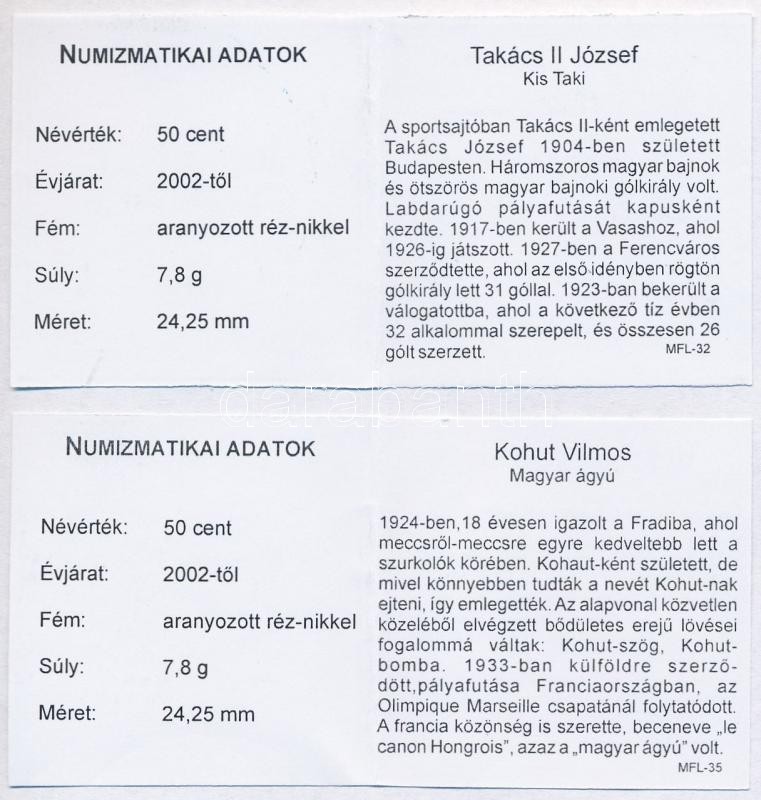 1992-2016. 50c Cu-Ni aranyozott, festett multicolor érem (2x) "A Magyar Foci Legendái" sorozat: Kohut Vilmos, Takács II József T:2