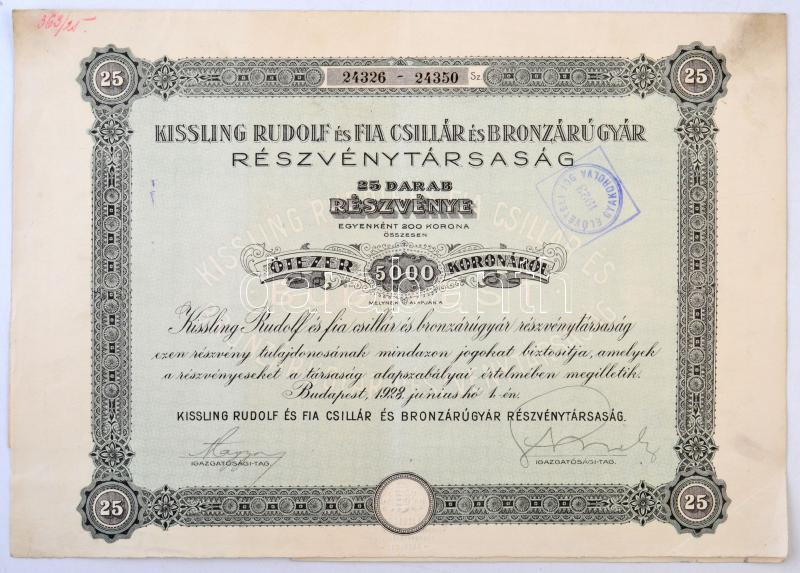 Budapest 1923. "Kissling Rudolf és Fia Csillár és Bronzárúgyár Ré... https://www.darabanth.com/en/281-Online-auction/281.0/Numismatics/Shares-and-Tickets~300005/Budapest-1923-Kissling-Rudolf-es-Fia-Csillar-es-Bronzarugyar-Reszvenytarsasag-25-db-re~II1439533
