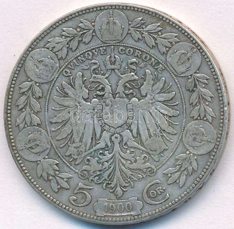 https://www.darabanth.com/en/281-Online-auction/281.0/Numismatics/Worldwide-silver-and-metal-coins~300013/Ausztria-1900-5K-Ag-Ferenc-Jozsef-T2-3--Austria-1900-5-Corona-Ag-Franz-Joseph-CVF-F--Kraus~II1446940