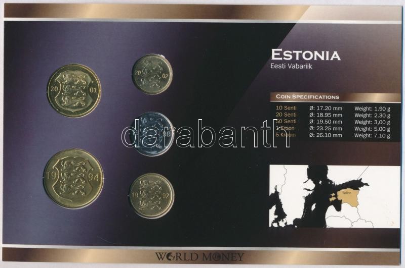 Észtország 1992-2002. 10s-5K (5xklf) forgalmi sor szettben, papírtokba... https://www.darabanth.com/en/281-Online-auction/281.0/Numismatics/Worldwide-silver-and-metal-coins~300013/Esztorszag-1992-2002-10s-5K-5xklf-forgalmi-sor-szettben-papirtokban-T1--Estonia-1992-2002-1~II1450047