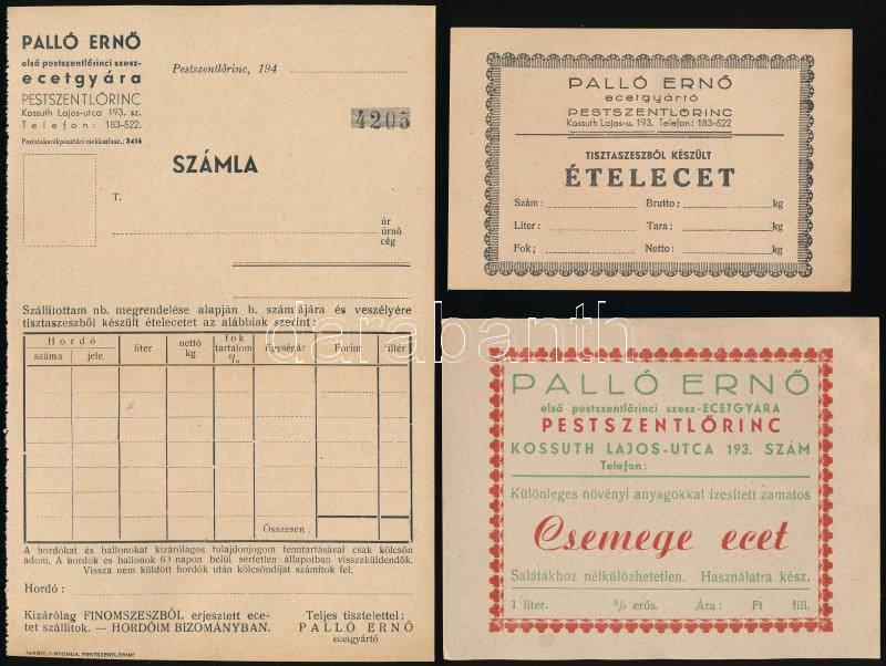 Palló Ernő Első Pestszentlőrinci Ecetgyárának szórólapjai, hordóelismervénye, kitöltetlen számlája