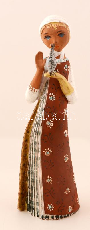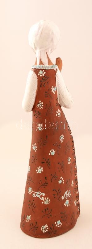 KM jelzéssel: Lány madárral. Kézzel festett kerámia, apró kopással, m:45 cm